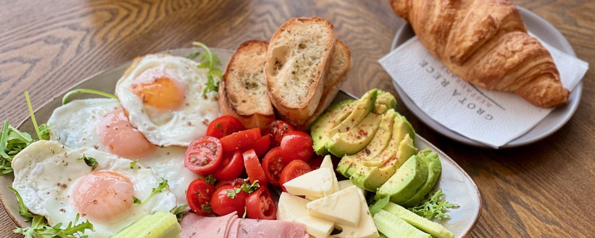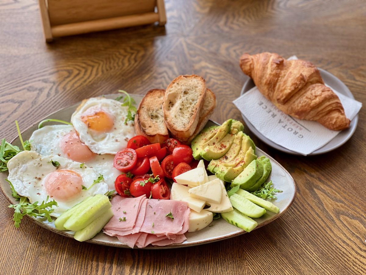 Mic dejun compplet cu oua ochiuri , sunca presata , mozzarella , avocado , rosii cherry , castravete , si croissant proaspat. Gust echilibrat , inceput perfect.
